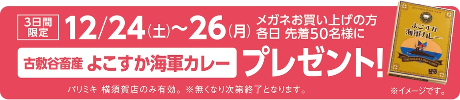 オープンを記念し12/24(土)~26(月)の3日間、メガネをお買い上げの方 各日先着50名様に、古敷谷畜産「よこすか海軍カレー」をプレゼント!