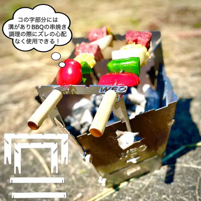 現行の「WEO やきにく用焚火台」を、もう一段階上の快適ギアにバージョンアップさせたい本格ソロキャンパーさんに向けに適したサイズとなっています。