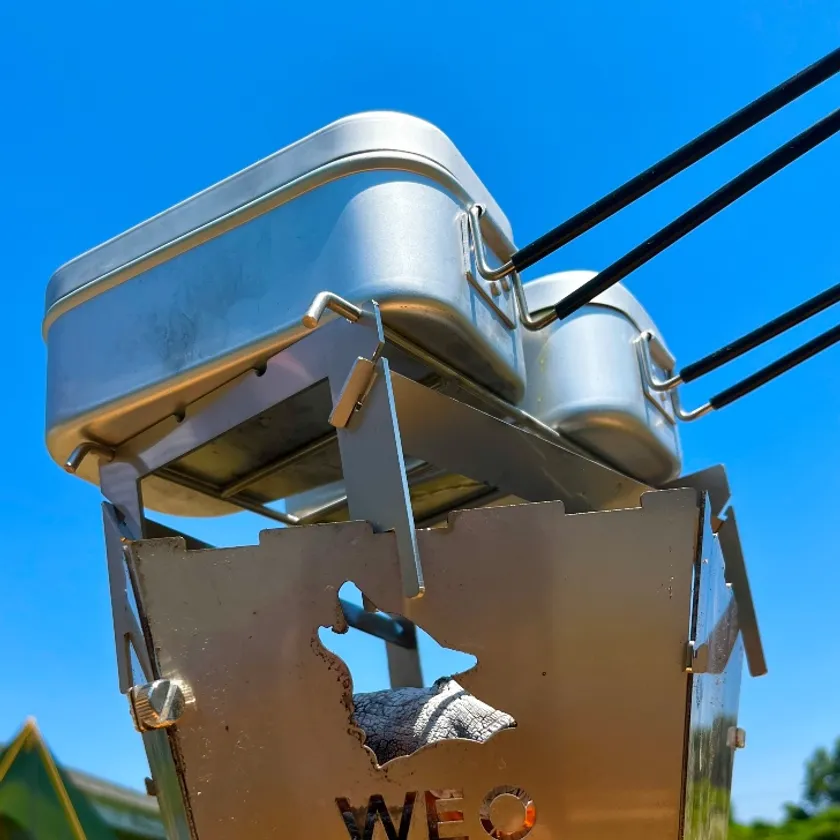 今回はさらに、「WEO やきにく用焚火台」を使用時や調理する際に、ケトルやメスティンなどの調理器具を乗せたままでも薪や炭を追加しやすいオプションギアを作製いたしました。