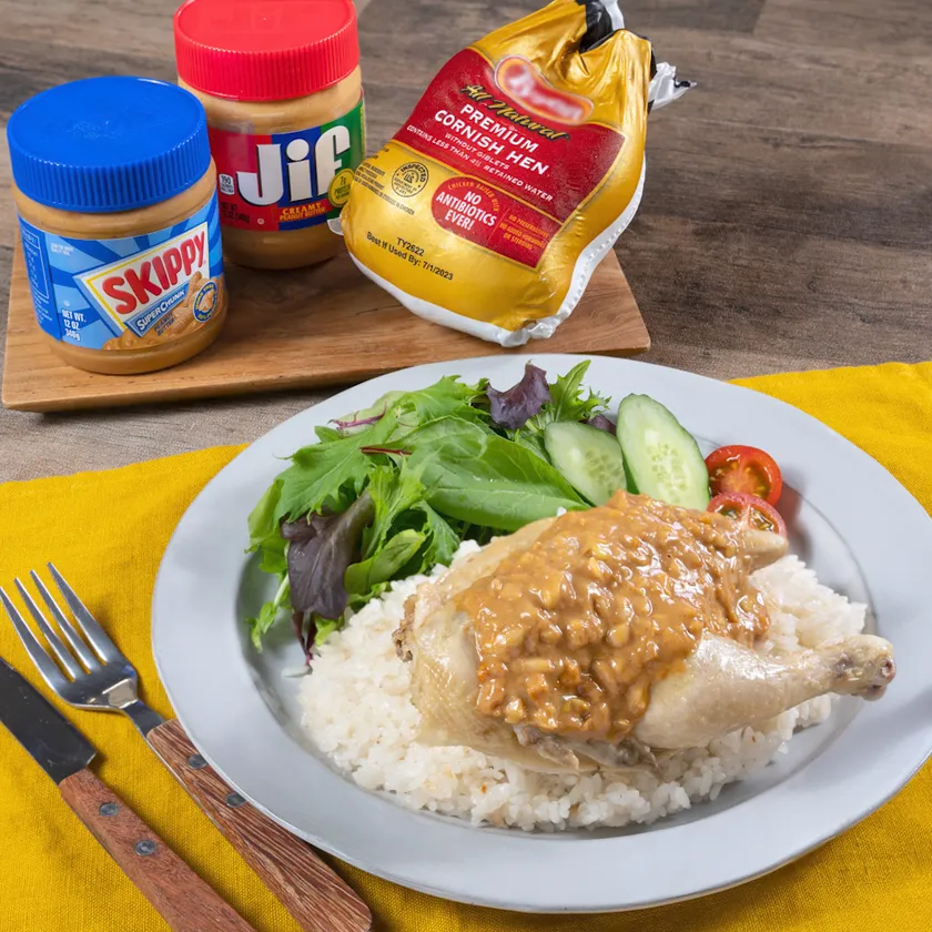 今回のレシピでは、「アメリカ産ピーナッツバター」を、長ねぎやラー油の風味を合わせ、濃厚で食欲をそそるソースとして使用いただいております。また炊飯器を用いたお手軽調理ながら、丸ごと調理が可能な小さなアメリカ産丸鶏「ゲームヘン」を使った、ボリューム満点かつ丸鶏の旨みを感じられる一品となっています。