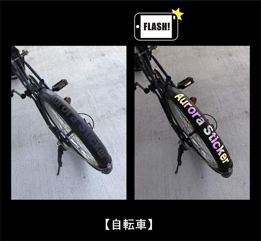 オーロラリフレクター光り方に特徴があり、角度によって光る色が変わり、安全性プラス見た目の面白さがあります。あっと驚く事間違いなしでインスタ映えします。