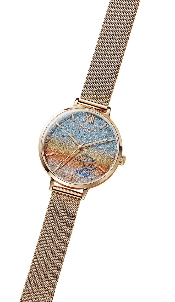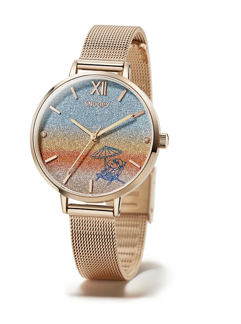 スヌーピーの素敵なバカンスをイメージした<スヌーピー しあわせのサンセットビーチ>ダイヤモンド入り きらきらグラデーションウオッチ新発売!