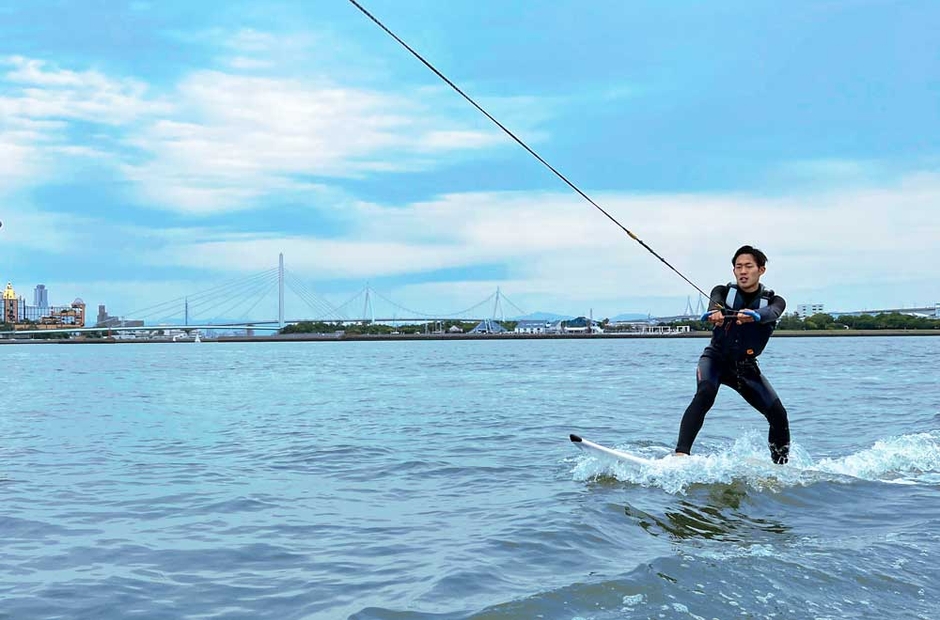 ウェイクサーフィンは、走行するボートから発生した引き波の力を利用して波に乗るマリンスポーツです。 船が進む限り同じコンディションの波が発生するので、初心者の方にもおすすめです。 ある程度の基礎スキルさえあれば誰でもロングライドが可能になります!