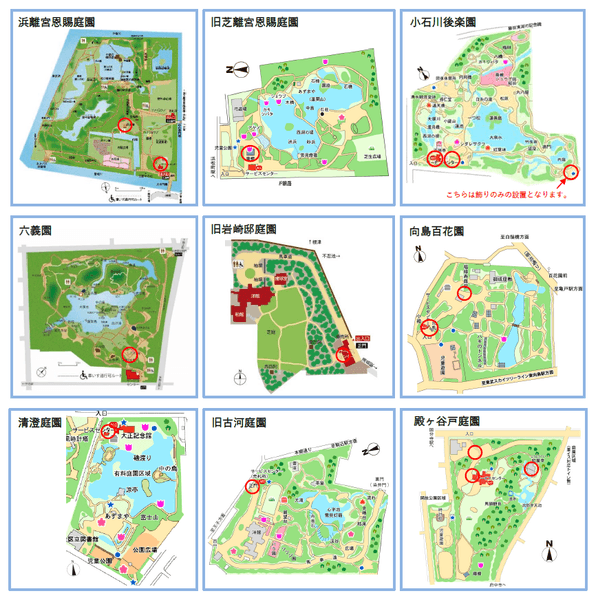(浜離宮恩賜庭園・旧芝離宮恩賜庭園・小石川後楽園・六義園・旧岩崎邸庭園・向島百花園・清澄庭園・旧古河庭園・殿ヶ谷戸庭園)