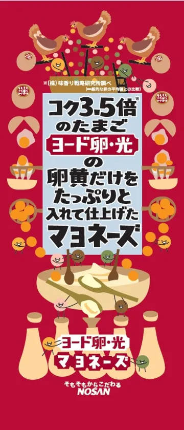 2020年12月にリブランディングを実施した「ヨード卵・光」とブランドを統一し、飼料をモチーフにしたキャラクター「たまれっと」やリニューアルロゴを使用。一目で商品特徴が分かるようなキャッチフレーズを中心に、周囲には飼料メーカーのNOSANならではの、ニワトリの食べるエサからこだわり作った卵の卵黄だけをたっぷりと使用して丁寧にマヨネーズを仕上げているイラストが配置され、「そもそもからこだわって」作ったことが伝わるようにしました。