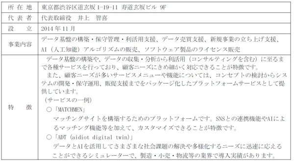 アイディオット社は、AI(人工知能)を用いたデータプラットフォームを構築し、データの収集・分析から利活用(コンサルティングを含む)まで、お客様にきめ細かいサービスを提供できるという強みを有しています。そして、これを活かして、マッチングサイトを構築するためのパッケージサービスのほか、デジタルツインを用いたシミュレーションサービス等を展開しており、さまざまな企業や自治体のプロジェクトにも参画しています。