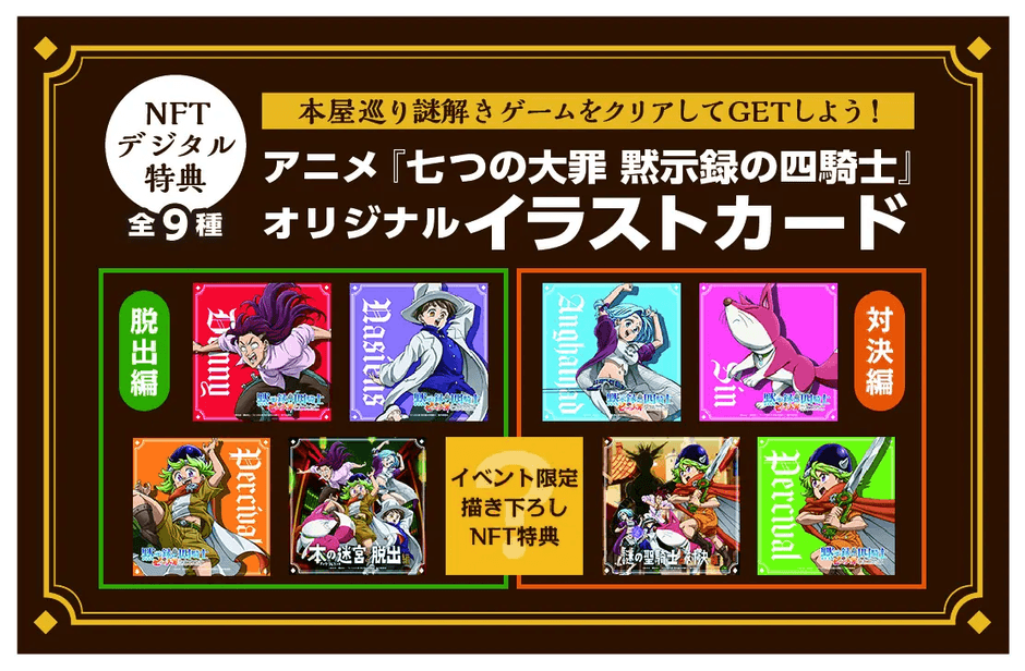 リアル謎解きゲームを使ったプロモーションを提案するイベント企画制作会社、株式会社ハレガケ(本社:東京都豊島区、代表:黒田洋介)は、東京都書店商業組合主催のもと、TVアニメ『七つの大罪 黙示録の四騎士』×本屋巡りLINE謎解きゲーム「本の迷宮(ブック・ラビリンス)からの脱出」編、「謎の聖騎士との対決」編の2種を東京都内の各書店(約180店舗)にて開催中です。ゲームをクリアされた方には、クリア特典として今回のイベント限定の「描き下ろしNFTデジタルアイテム」をプレゼントしています。