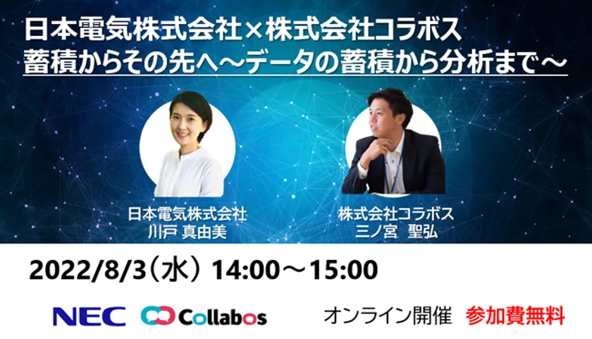 株式会社コラボス(本社:東京都千代田区、代表取締役社長:茂木貴雄、以下「当社」)と日本電気株式会社(本社:東京都港区、執行役員社長 兼 CEO:森田 隆之、以下「NEC」)は共同で、無料オンラインセミナー「蓄積からその先へ~データの蓄積から分析まで~」を2022年8月3日(水)14時00分より開催いたします。