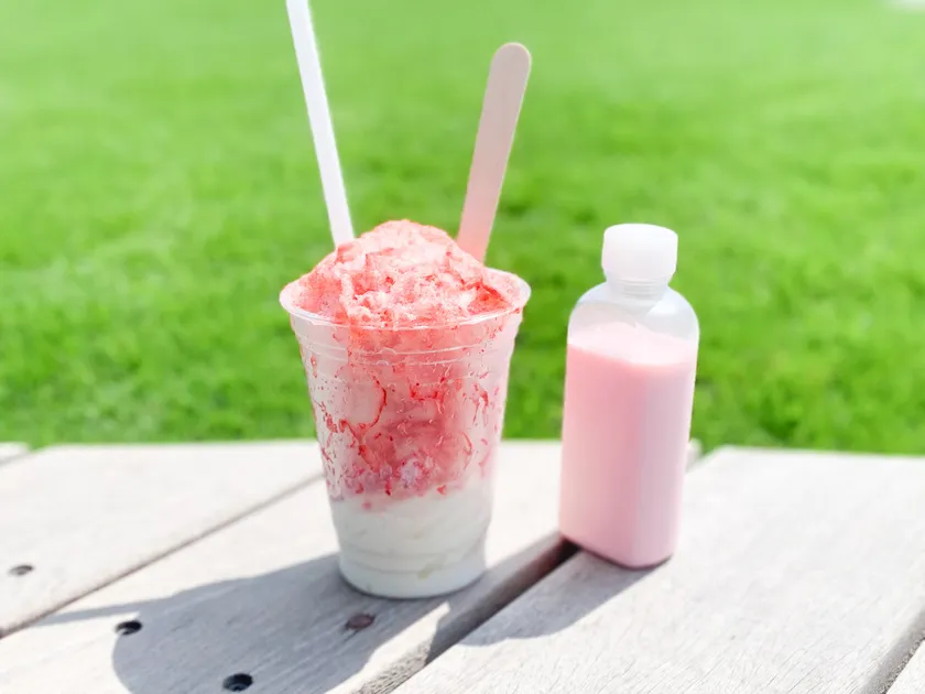 最初はかき氷で完熟いちごを味わったあと、ミルクフラッペが楽しめる2度美味しいスイーツに仕上げました。