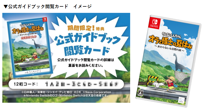 JNSホールディングスの子会社であるネオス株式会社(本社:東京都千代田区、代表取締役社長:池田 昌史)は、Nintendo Switchソフト【クレヨンしんちゃん 『オラと博士の夏休み』 ~おわらない七日間の旅~】」(以下、本ソフト)のパッケージ版購入特典として、公式ガイドブック(双葉社発刊)をPCやスマートフォンで閲覧できる「公式ガイドブック閲覧カード」を全国のTVゲーム取り扱い店舗で展開いたします。