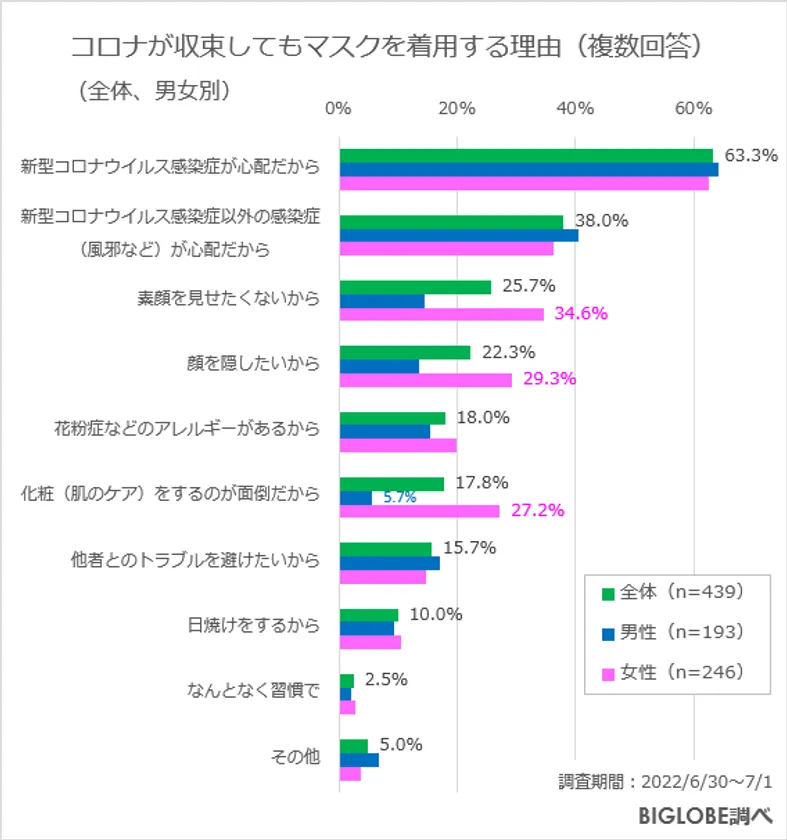 コロナが収束しても約4割がマスクを着用、理由は「顔を隠したい」 BIGLOBEが「コロナが収束した後の 行動に関する意識調査」第1弾を発表 ~マスク着用の方針が緩和されても 公共交通機関でマスクを外す人は5.7%~