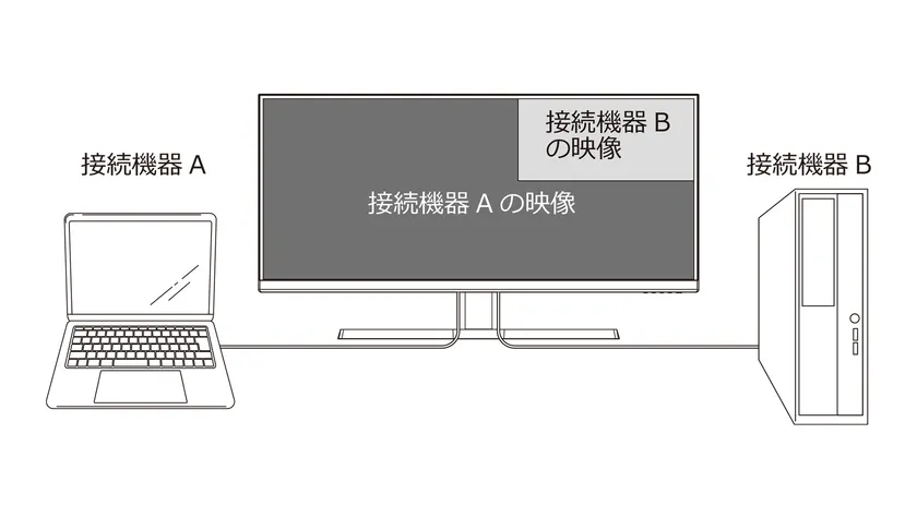 解像度がUWQHD(3440×1440)となっており、フルHD(1920×1080)よりも約2.4倍の作業領域が表示可能となります。通常液晶モニターに比べ、視野が広いので迫力のあるゲームプレイが可能です。ウィンドウを横並びにしてのデスクワーク作業や動画編集、写真編集といったクリエイティブな作業にも適しています。PIP(ピクチャー・イン・ピクチャー)とは、異なる2つ以上の入力ソースを1つの液晶モニターで重なるように小画面を表示させることができる機能で、ゲームをプレイしながら攻略サイトを見たり、作業をしながら小画面で動画を見たり、様々な用途でご使用いただくことが可能です。PBP(ピクチャー・バイ・ピクチャー)とは、異なる2つ以上の入力ソースを2画面に分割で表示できる機能で、フレームレスでデュアルディスプレイを体験でき、デスクスペースの関係で液晶モニターを2台設置することができない、といった方にもおすすめです。