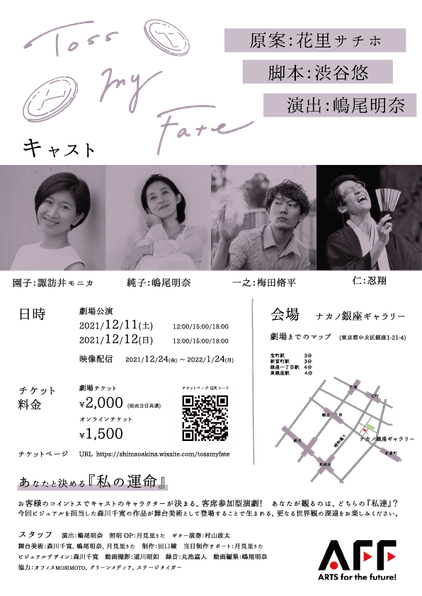 たのしいくわだて(拠点:東京、主宰:嶋尾明奈)は、演劇×アートのギャラリー公演となる【vol.5カムバック!公演withヤマナシリタ「Toss My Fate」】を2021年12月11~12日に有観客で、12月24日~(予定)2022年1月24日に映像配信で行います。
