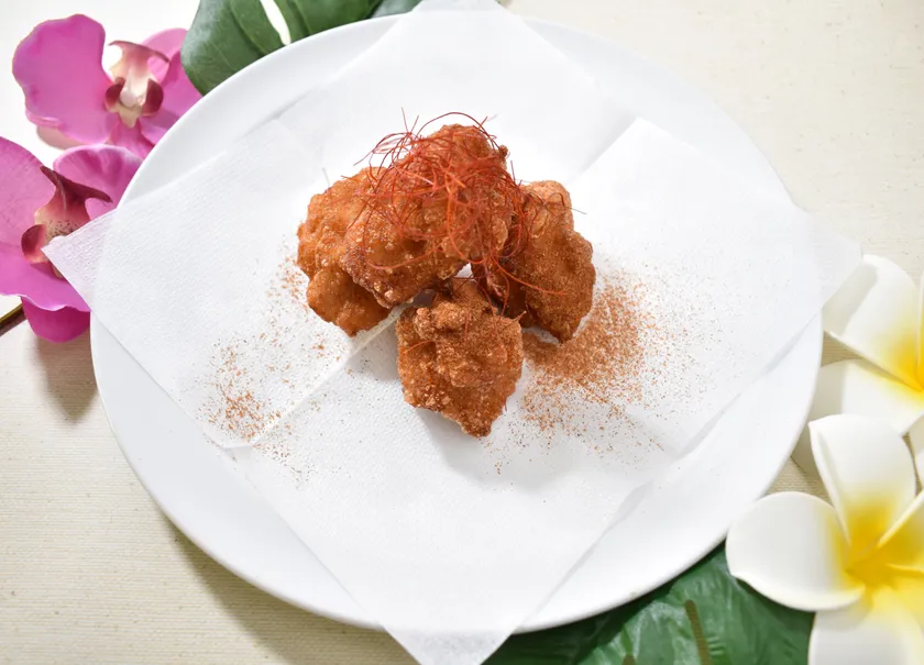 現地語で『揚げた鶏肉』を意味する定番料理です。株式会社シマナカの加工により柔らかく仕上げた鶏のから揚げにオリジナル調合のスパイスを絡めた商品です。霜降は現地で食べた味が忘れられず、日本の店舗でもいつか提供したいと願っており、今回のフェアに導入しました。