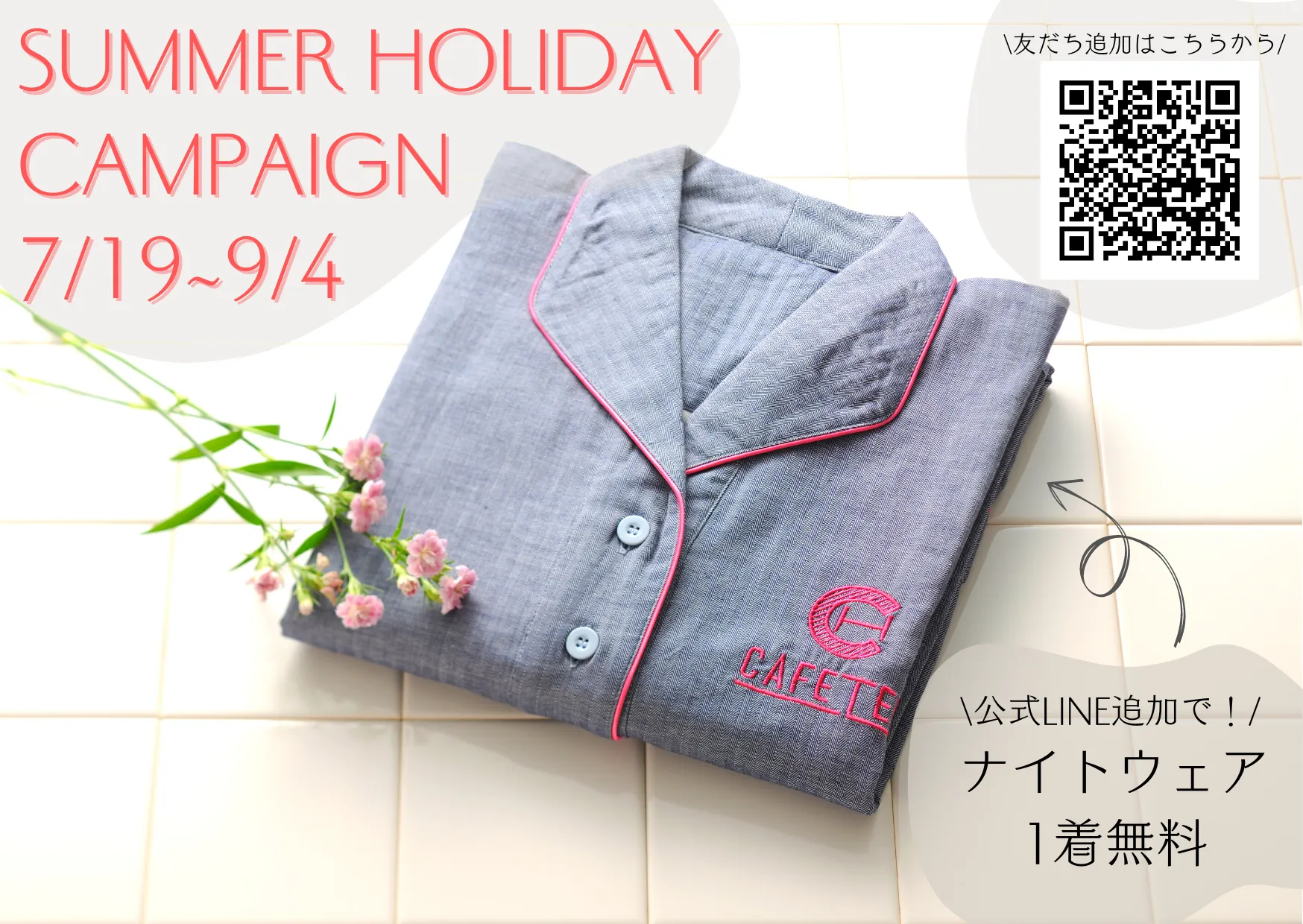 待ちに待った夏休み!ご予定はもうお決まりですか?家族でバーベキューに行ったり、普段はなかなか会えない友人に会ったり、ちょっぴり遠くへ旅行したり…過ごし方は多種多様ですね。CAFETEL 京都三条 for Ladiesでは、ナイトウェアレンタルが無料になる「夏休みキャンペーン」を行います。キャンペーン適用条件は、CAFETELの公式LINEを友だち追加していただくだけ!すでに登録いただいている方はもちろん、チェックイン時に追加してくださった方も適用されます!みんなでおそろいのナイトウェアを着て、夏の思い出を作っちゃおう☆