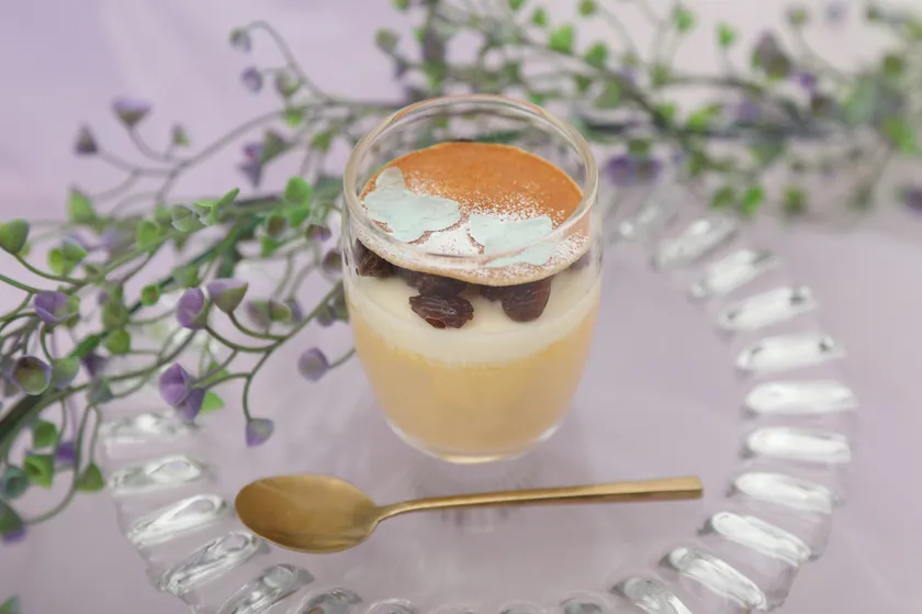 “プリンの女王 磯貝由起”さん監修のもと、ネオどら焼きの作り手である店主が考案した2つめの美しいプリンはラム酒が薫る大人のどら焼きプリン。卵の味を感じるプリンの上には、ラムの薫るクリームチーズのムース、そしてトップには美しい寒天でできた蝶々。見た目も味わいも大人が満足いく一品となっています。