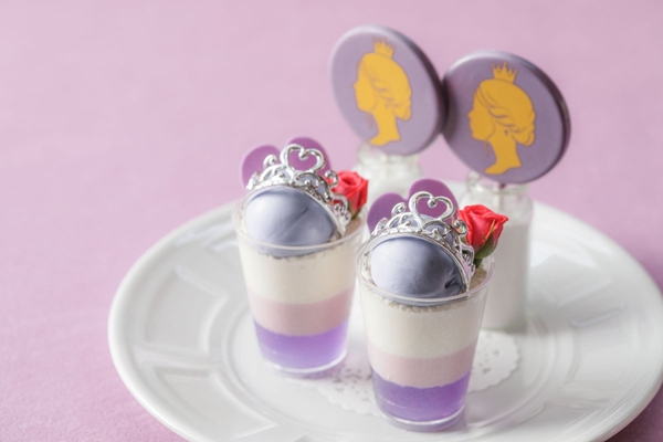 ・スタンド: (上段)薔薇とライチのヴェリーヌ/プリンセスロリポップショコラ(中段)ラベンダーとカシスのオペラ/はちみつのパンナコッタ バタフライピージュレ(下段)すみれの琥珀糖/レモンとベリオットのムース/ぶどうのマフィン