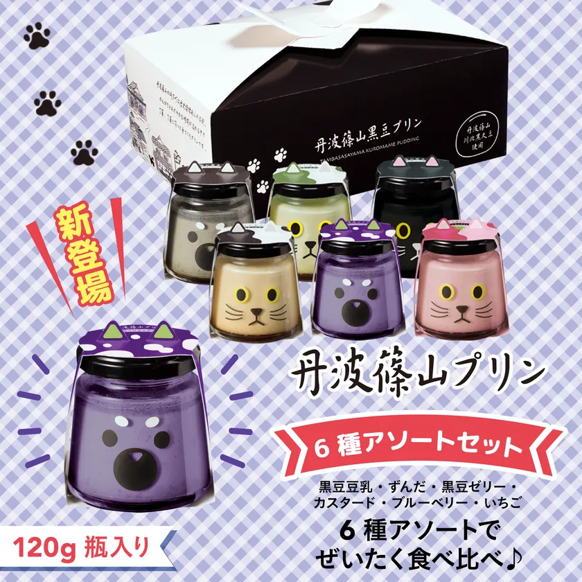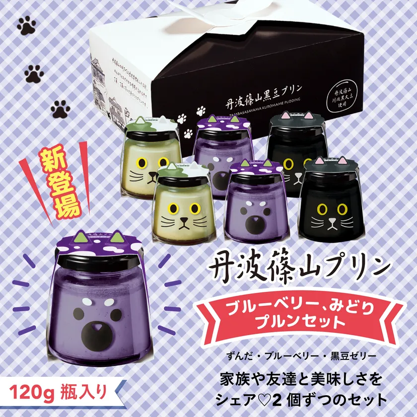 「丹波篠山黒豆プリン・クロちゃんマメちゃん」シリーズのパッケージは柴犬と和猫がモチーフ、ブルーベリーのプリンはなんと紫の柴犬という意外性でみんなで食べると和みの時間が生まれるのは間違いありません。ブルーベリーだけでなく丹波篠山の恵みが味わえるアソートセットも発売します。