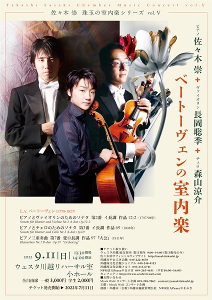Musik Waldコンサート企画主催、ベートーヴェンの室内楽『佐々木崇珠玉の室内楽コンサートvol.5』が2022年9月11日 (日)にウェスタ川越リハーサル室(小ホール) (埼玉県川越市新宿町1-17-17)にて開催されます。