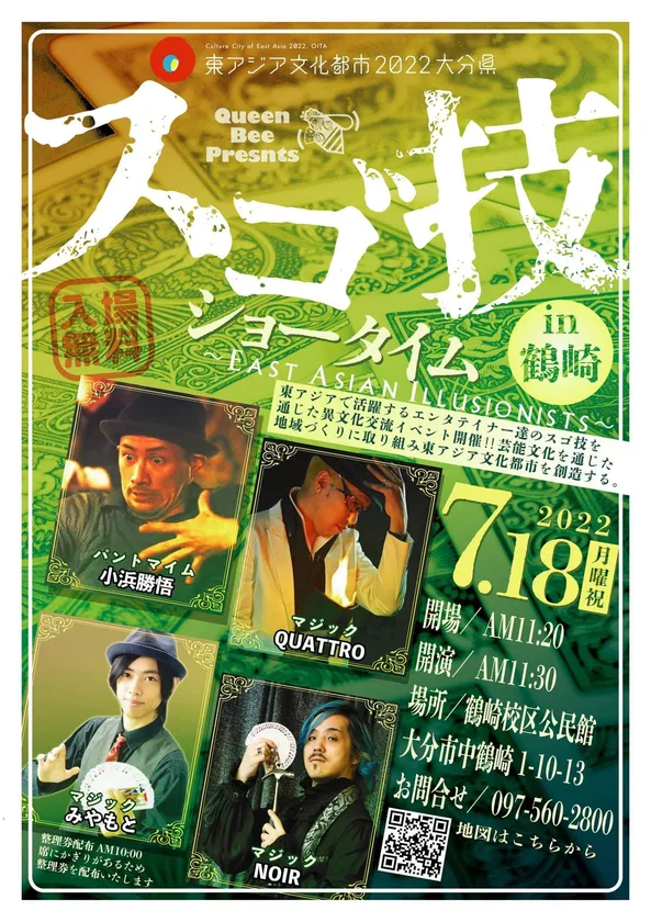 マジックバー・Queen Bee(クイーンビー)は2022年7月18日(月)、大分県大分市にある鶴崎校区公民館にて「スゴ技ショータイム in 鶴崎 ~East Asian illusionists~」を開催いたします。東アジアで活躍する、マジック・ジャグリング・パントマイムのエンターテイナーたちのスゴ技を間近で見るチャンスです。観覧は無料ですので、皆さまお誘い合わせの上、是非ご来場ください。