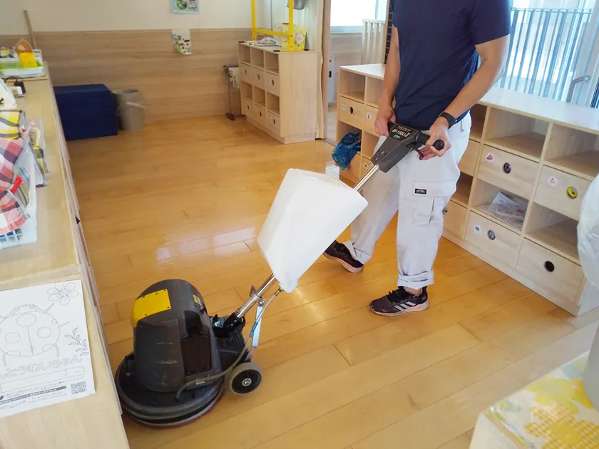 従来、各保育園では職員の方が休日や祝日などに保育士・スタッフを総動員で出勤し、絵本や玩具類、重い什器などを移動させてお子様が滑りにくいワックスなどを使用した床面洗浄ワックス塗布作業を行っていましたが、職員への負担が大きく解決策を模索されておりました。