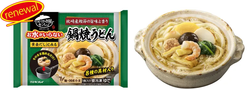 株式会社キンレイ(本社:京都市伏見区、代表取締役社長:白潟昌彦)はスープ・具付き冷凍麺市場売上NO.1ブランド※2「お水がいらない」シリーズから定番商品である「お水がいらない 鍋焼うどん」「お水がいらない 味噌煮込みうどん」を5年ぶりにリニューアルし、8月22日(月)から全国の量販店の冷凍コーナー・公式オンインショップ( https://kinrei-shop.jp )にて順次発売します。