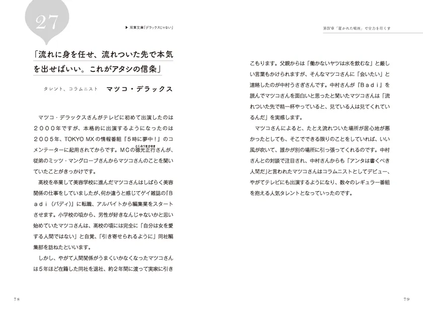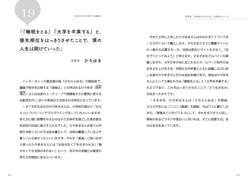 人が生きていくうえでたしかに環境も才能もとても重要なものですが、似たような環境で育った人が同じような人生を歩むわけでないように、大切なのは「どう生きるか」という生き方です。才能や環境は自分で選ぶことはできないとしても、「どう生きるか」という生き方そのものは自分で選ぶことができます。現代を代表する一流人たちの10代、20代の挫折と成功にスポットをあてて紹介します。