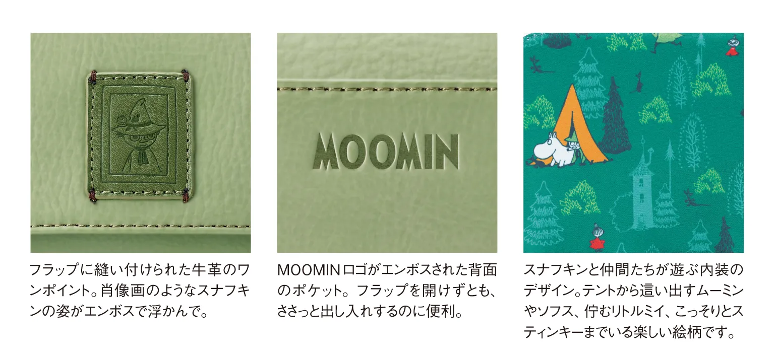 外装は植物の葉のような、やさしいアッシュグリーンと落ち着いたカーキの2色の革のコンビネーション。フラップにはワンポイントでさりげなく、スナフキンがエンボスで浮かび上がります。