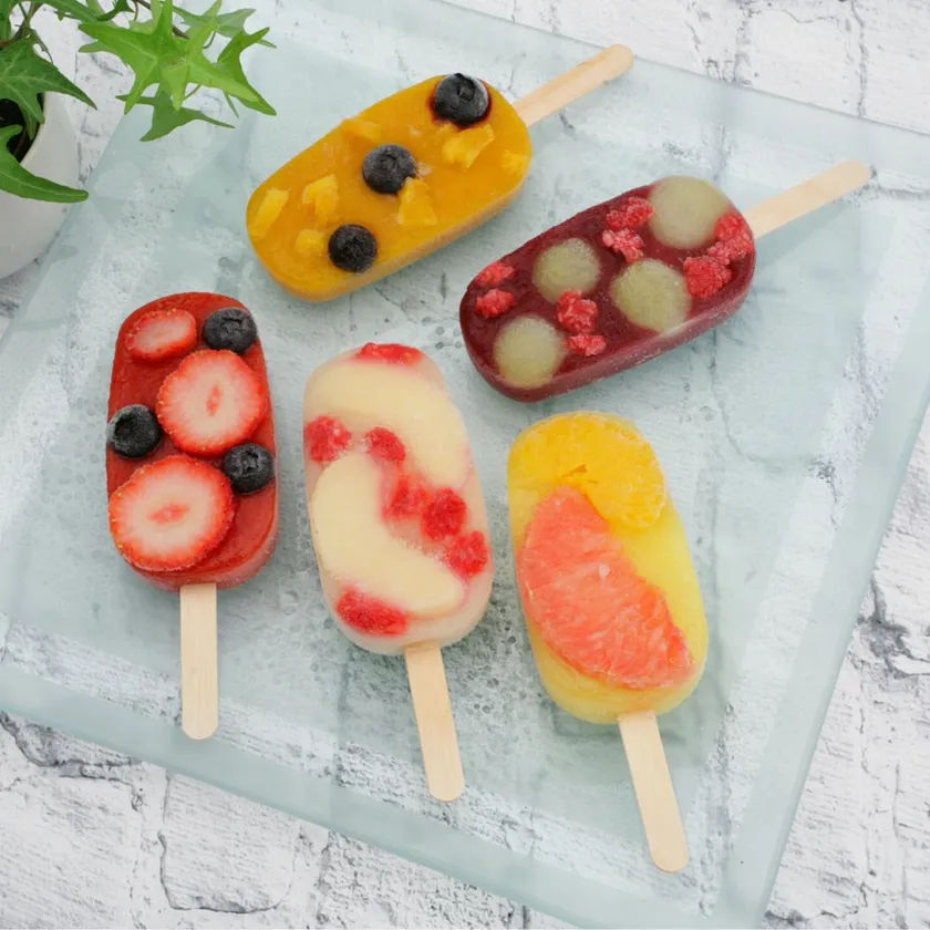 当社の「葛アイスキャンデー」は様々なフルーツを使用し全5種(いちご、桃、みかん、ぶどう、マンゴー)の商品展開をしております。華やかな見た目と葛粉を使用しているため、溶けても美味しくお召し上がりいただくことができ、お盆・帰省シーズンの手土産や自宅用のおやつとしてぴったりです。