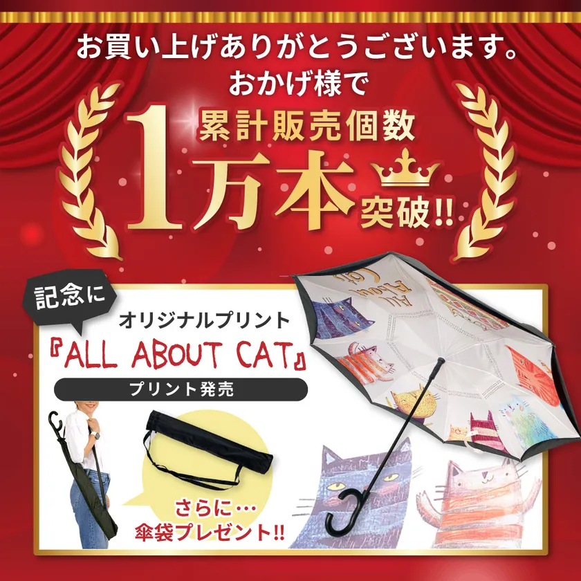 自立する傘「逆さ傘」の販売本数1万本の記念として ご購入の方に肩から掛けられる傘袋プレゼントを実施!