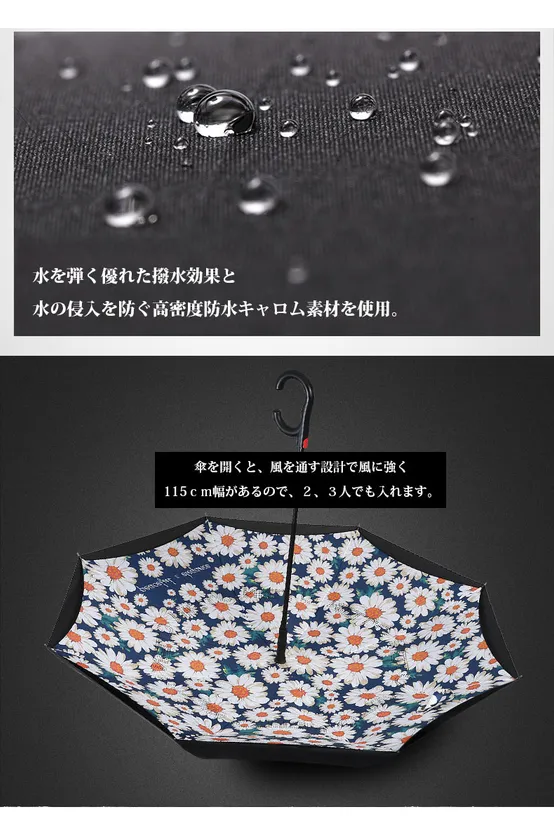 傘が普通とは逆に開閉できることで、濡れるリスクを減らせます。上下が逆さまに開く仕組みになっているため、これまでは傘をさして濡れてしまった場面でも、しっかりと雨粒を防いでくれます。