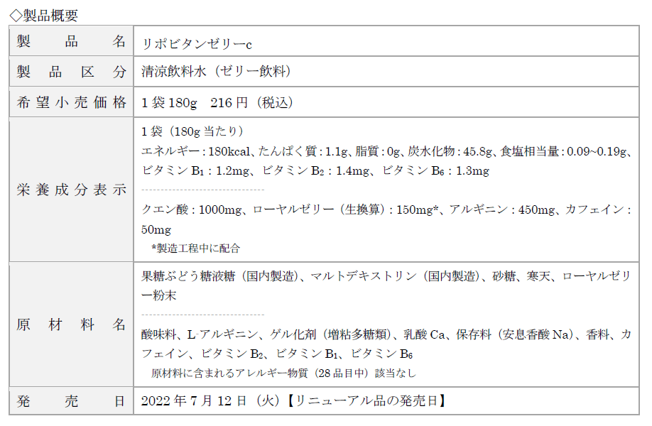 大正製薬株式会社[本社:東京都豊島区 社長:上原 茂](以下、当社)は、手軽にエネルギーをチャージできる「リポビタンゼリー」(清涼飲料水)のパッケージを全面リニューアルし、7月12日(火)より全国のドラッグストア、コンビニエンスストア、スーパーマーケット等にて発売開始いたします。