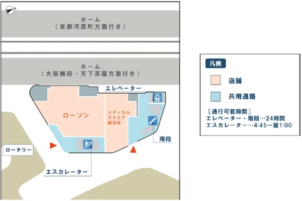 まず、本ビルと直結する南茨木駅(阪急京都線)への動線については、エレベーターと階段を先行して設置し、供用を開始しておりますが、今般、これに加えて、ビル内にエスカレーターを新たに設け、本年7月28日からご利用いただけるようになりました。