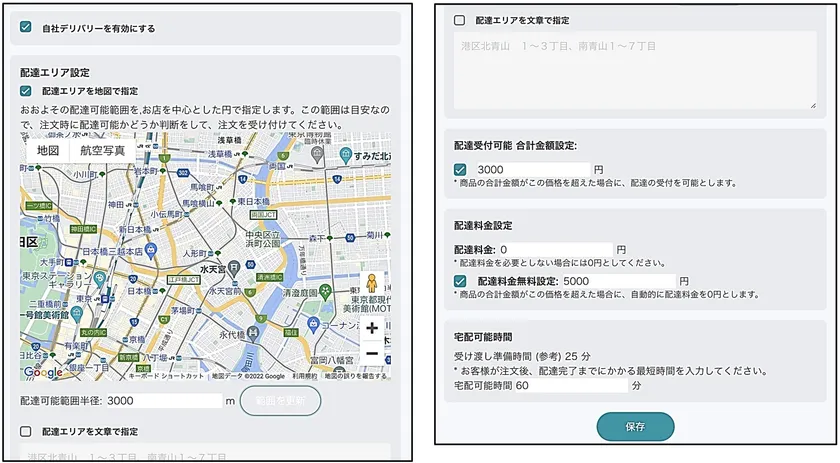 ■配達エリア設定:配達エリアを地図と半径のメートルで指定/文章で指定