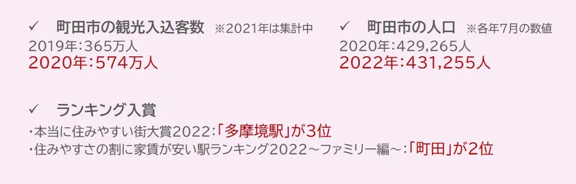また、町田市の観光客数や人口は直近3年で右肩上がりに増加傾向で、『本当に住みやすい街大賞2022』などのランキング入賞も果たしていることなど、高まる町田市の人気度についてもアピールしていました。