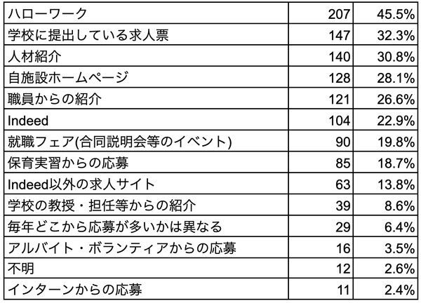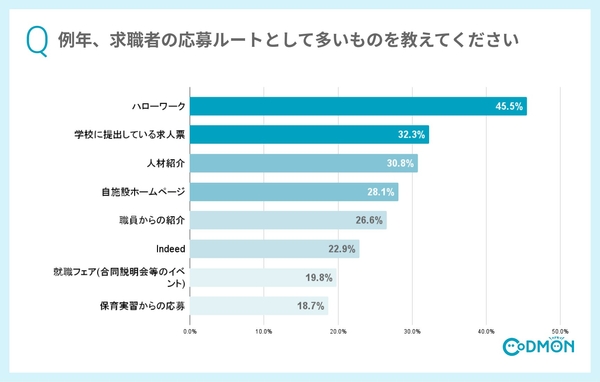 求職者の応募ルートとして一番多かったのが「ハローワーク」(45.5%)で、二番手が「学校に提出している求人票」(32.3%)でした。「人材紹介」を使っている施設も3割を超えました。
