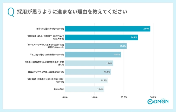 *採用が思うように進まない理由は、「新卒の応募がまったくなかった」(29.0%)に「『労働条件』(給与・福利厚生・働き方など)の魅力不足」(24.8%)。