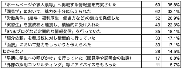 *採用がスムーズに進んでいる施設は、積極的に情報発信を行っている傾向(「『ホームページや求人票等』へ掲載する情報量を充実させた」が35.8%、「『労働条件』(給与・福利厚生・働き方など)の魅力を発信した」が26.9%)。
