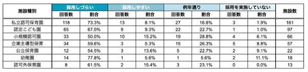 また、施設種別で見ると、幼稚園(77.8%)・私立認可保育園(73.3%)・認定こども園(67.0%)の順に「採用しづらい」と回答した施設が多い結果となりました。