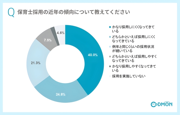 株式会社コドモンは、保育・教育施設向けICTサービス「コドモン」を利用中の全国の保育施設等を対象に、保育士の採用についてのアンケートを実施しましたので、調査結果をお知らせいたします。