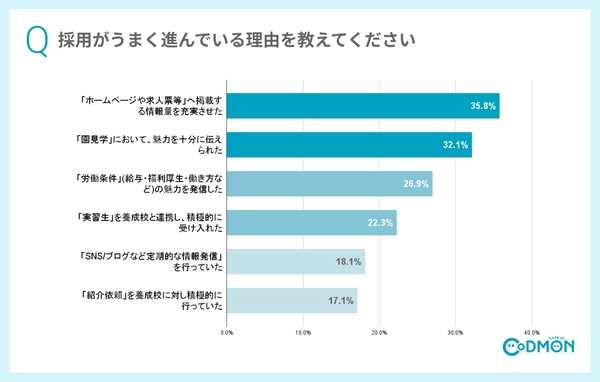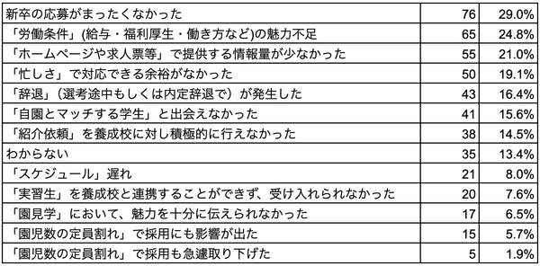 一方で、採用が思うように進んでいない施設が要因としては、「新卒の応募がまったくなかった」(29.0%)に「『労働条件』(給与・福利厚生・働き方など)の魅力不足」(24.8%)、「『ホームページや求人票等』で提供する情報量が少なかった」(21.0%)が続く結果に。待遇面に加え、情報発信に課題を感じている施設が少なくない状況がうかがえます。