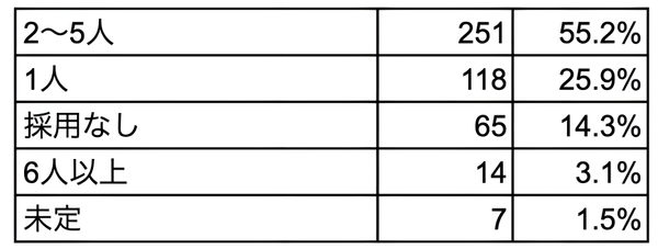 「2〜5人」を採用予定と答えた施設がもっとも多く、過半数を超える結果となりました。