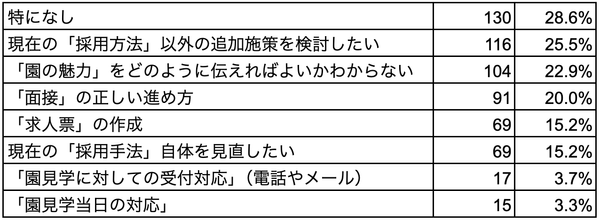 採用を行う上での悩みは「特になし」がもっとも多く28.6%。具体的な悩みとしては、「現在の『採用方法』以外の追加施策を検討したい」(25.5%)に続き、「『園の魅力』をどのように伝えればよいかわからない」(22.9%)が多くの票を集める結果に。求職者に対して、施設理解をどう深めていくか、多くの施設が頭を悩ませていることがわかりました。