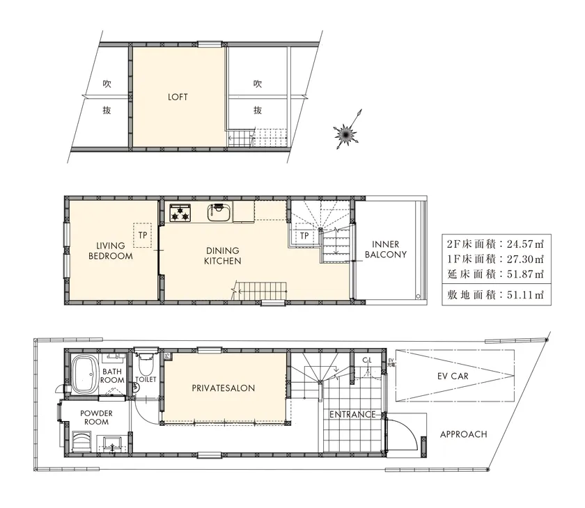 1階には、玄関ホールから続くプライベートサロンがあり、ここが「パーソナルスタジオ+イエ(パーソナルティーハウス)」の中核となるスペース。ガラスの仕切りを備えた4.5帖ほどの空間で、リモートワークをするもよし、ネイルやエステのサロンを開業するもよし。趣味で作っている雑貨を販売したり、作品を制作・展示するアトリエ兼ギャラリーにするのもいいかもしれません。1階には、このほか、バスルーム、トイレ、手洗いがあり、例えば、プライベートサロンでヨガのレッスンをして、バスルームで汗を流すこともできる造りです。