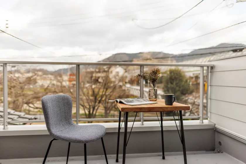 このモデルハウスでは機能性を追求していることも特徴です。それはインナーバルコニーの前に立つと最も感じることができます。2階への階段を上がった左手、一面の窓の外には、山科川と川沿いの桜並木の景色が広がっています。春には窓が桜色に染まるロケーションです。そして、少し離れたところに高速道路の壁が見えますが、室内にいると車を走る音は全くと言っていいほど聞こえてきません。これは、この部分の窓に遮音性に優れたアルゴンガス入りのペアガラスを採用しているため。この「パーソナルスタジオ+イエ(パーソナルティーハウス)」では、ゆずデザインがこれまで大切にしてきた自然素材に加え、省エネや耐震性といった機能性も重視しています。オンもオフも過ごす家だからこそ、より一層快適さが求められると考えているのです。