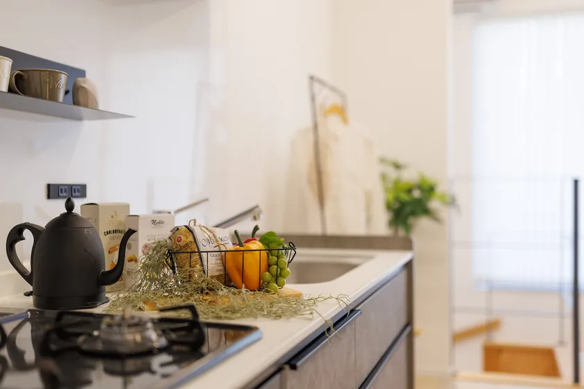 カラーは白を基調に、グレーとブラウンをバランスよく配置。使用している素材も、木材、タイル、アイアンと多様ながらも、それがメリハリを感じさせ、空間のアクセントとして調和しています。