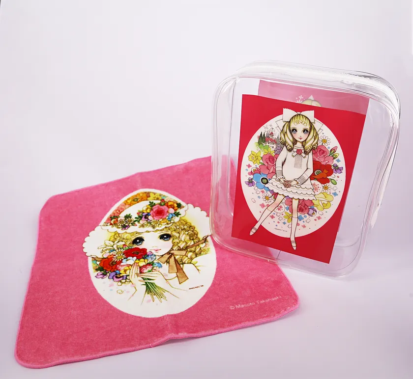 開催を記念して、70年代に少女雑誌の表紙や文房具、布製品などの原稿として描かれた懐かしのイラストを起用した新作グッズが登場します。今展をお祝いする福袋のような「ロープハンドルクリアバッグ『花帽子の少女』(グッズセット付)」¥11,000(税込)は、約35点・総額15,000円以上のグッズセット付という、嬉しすぎるアイテム。