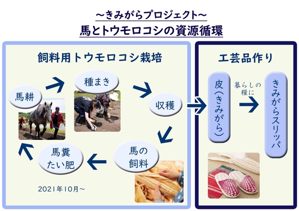 青森屋が2019年から取り組んできた「きみがらプロジェクト」は、馬の力を借りて畑を耕し、馬糞はたい肥となり、作物を育て食料を確保していたかつての青森の暮らしの再現を目指した活動です。2020年は、馬耕、トウモロコシの栽培、馬の飼料、皮を利用した工芸品づくりまでの資源循環に着手しました。2021年は馬糞のたい肥化を開始し、馬とトウモロコシの資源を無駄なく使う活動を継続していきます。