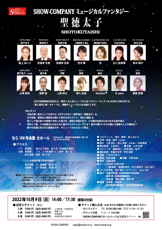 これまで東京・大阪を中心に公演、文化庁芸術祭にも参加、多くの観客を魅了して参りましたが、この二年間は、長期にわたるコロナ禍の影響により大規模な公演を自粛せざるを得ない状況でした。昨年から今年にかけては聖徳太子1400年忌にあたり、各地で聖徳太子関連の展覧会が催されました。SHOW-COMPANYは大いに刺激を受け、日本の文化、芸術、歴史的な見地からも有意義な取り組みとして、聖徳太子を題材に、JR奈良駅直結の大きなホール『なら100年会館』で、新作ミュージカルを公演することにいたしました。日本人ならではのミュージカルを創り上げ、奈良から日本国内へ海外へと愛と平和をメッセージする作品をお届けします。