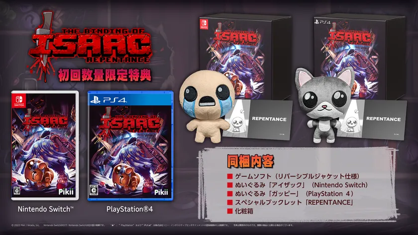 Nintendo Switch、PlayStation 4 パッケージ版は、数量限定でぬいぐるみ「アイザック」(Nintendo Switch版)、ぬいぐるみ「ガッピー」(PlayStation 4版)と、スペシャルブックレット「REPENTANCE」を化粧箱に同梱し販売します。
